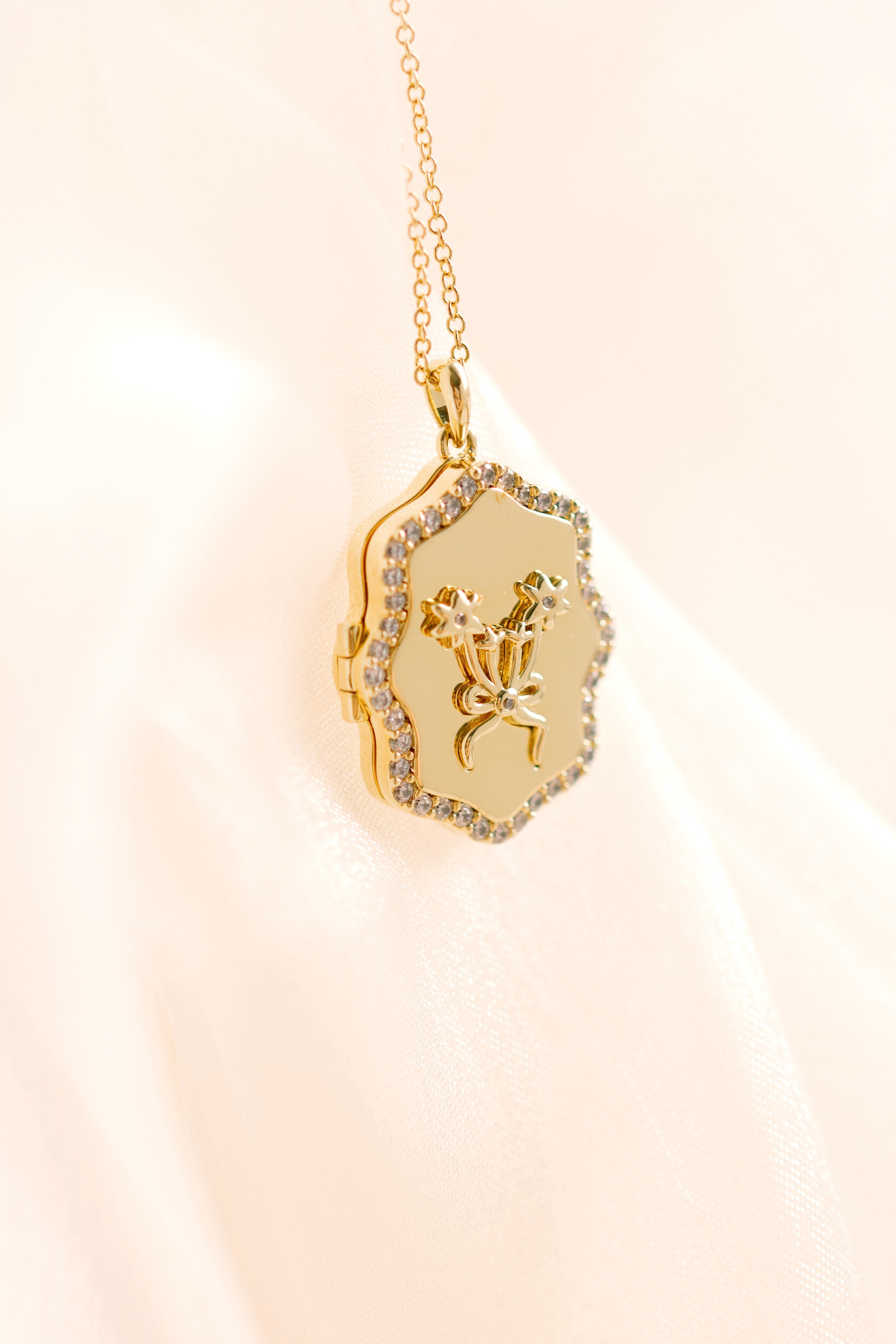 Hold your loved ones close with the Maisie Necklace, a locket filled with meaning and love. Each flower etched into its surface represents your favourite person, whether its your best friend, mother, Aunt, Grandma or anyone you hold dear, while the bow ties it all together, symbolising the nurturing embrace of a loved one.
