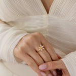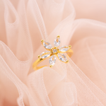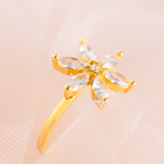 Introducing our charming 'Daisy Ring,' a radiant symbol of natural beauty. Crafted in gleaming gold, this ring features delicate crystal petals that mimic the enchanting allure of daisies. With its elegant design and sparkling crystals, this ring adds a touch of grace and femininity to any outfit, celebrating the timeless elegance of floral inspiration.Exquisitely handcrafted in small batches, made concisely with recycled metals, 18K Gold Plating.