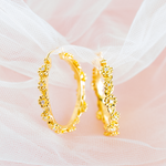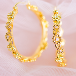 The Sarah Hoops. Inspired by blooming flowers and cascading vines, these earrings are straight from a fairytale. Filled with Hand-drawn details, golden petals, and sparkling crystals.